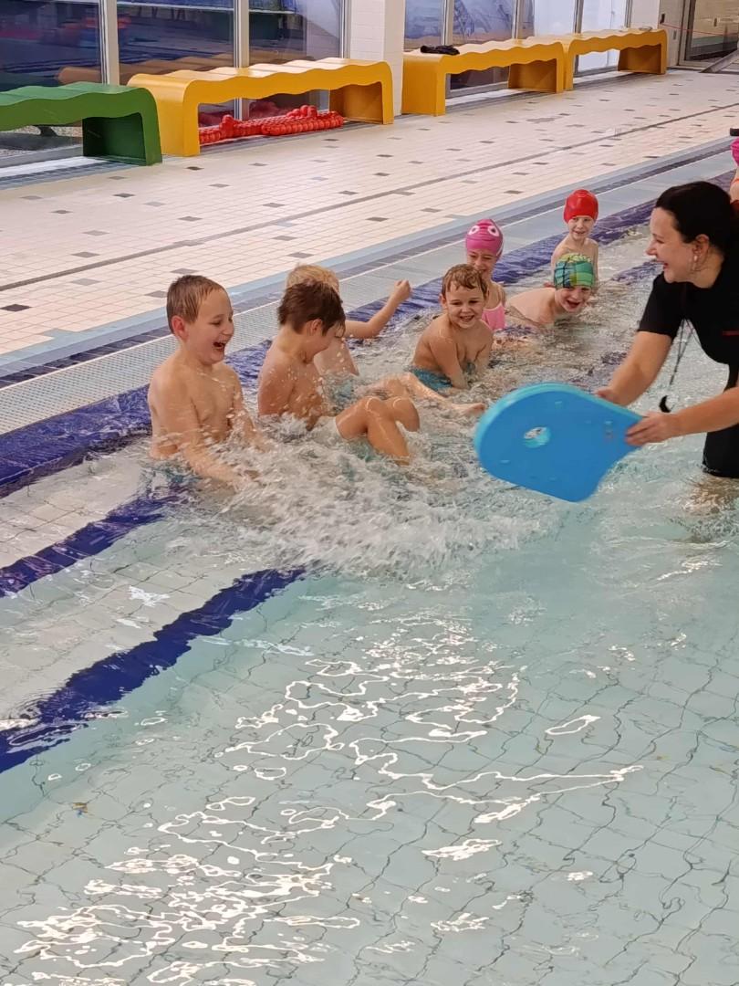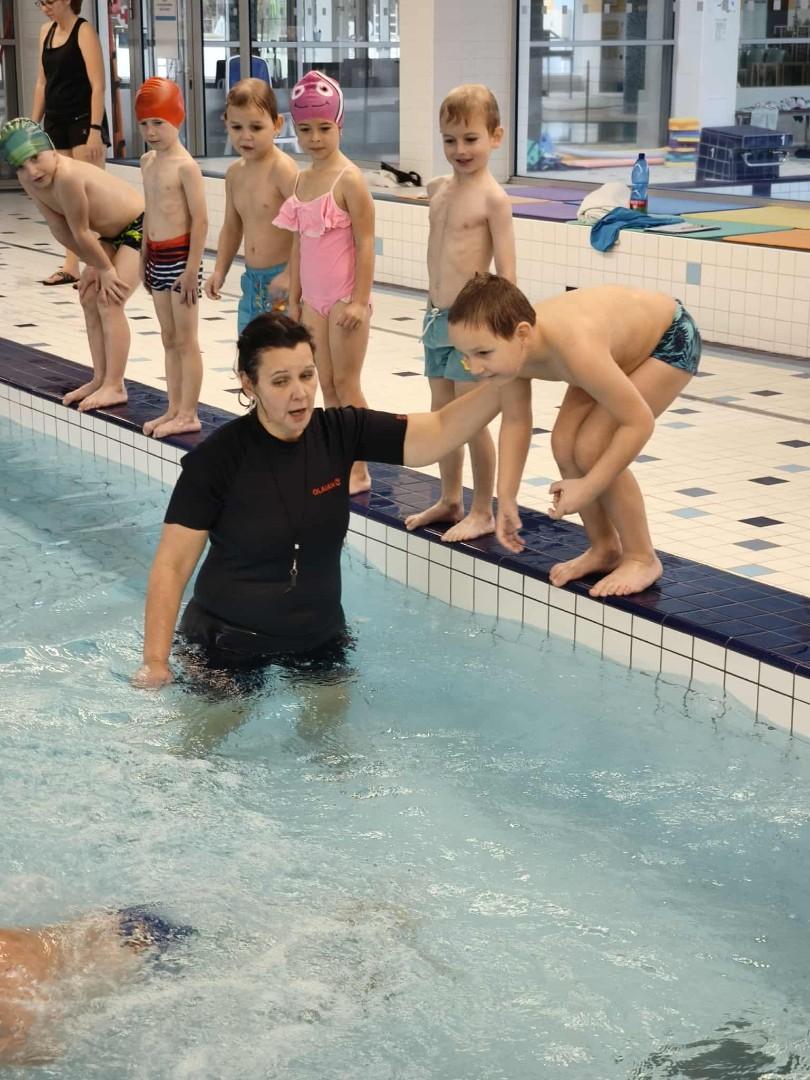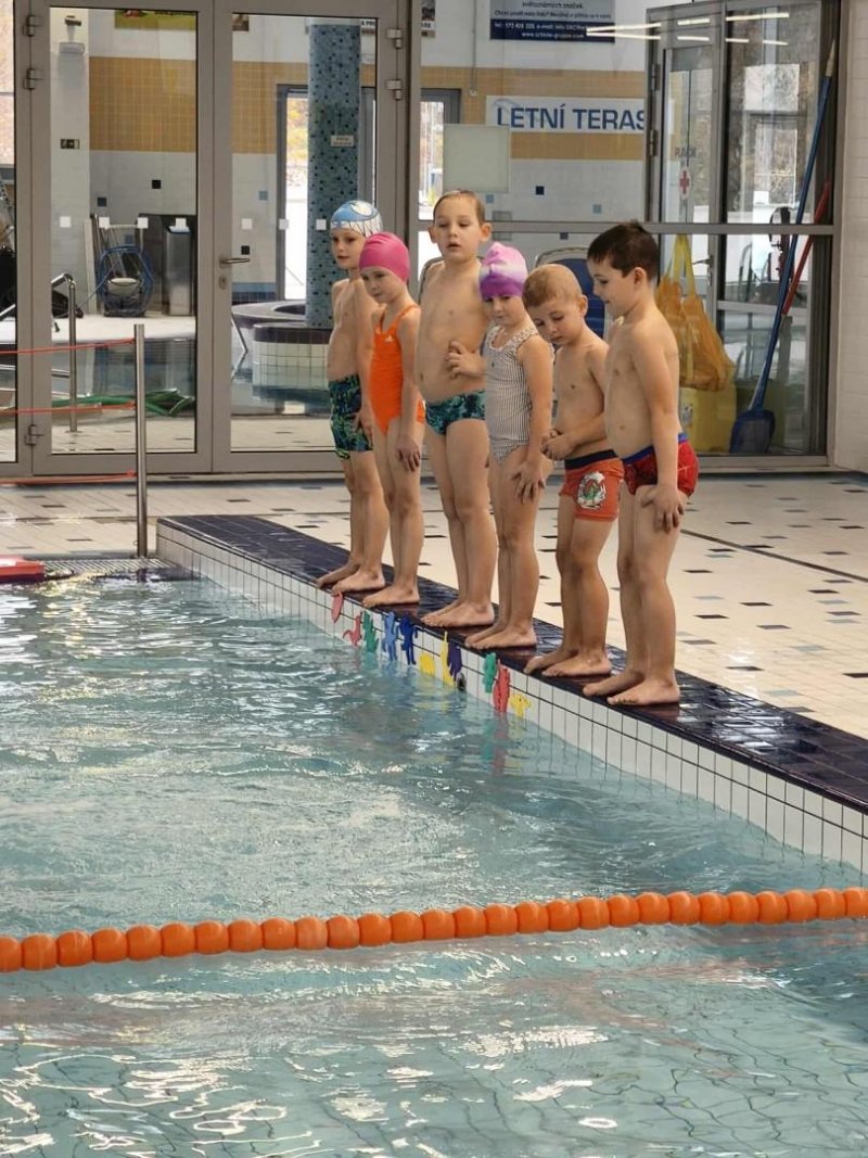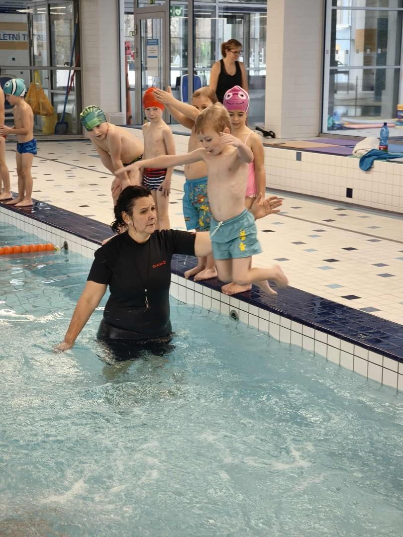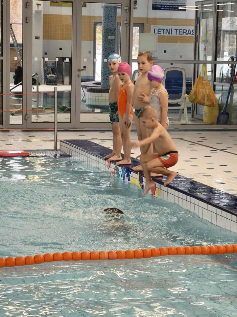Děti si 1. plavání moc užily, byly šikovné a všechny zvládly vodu v obličeji a skok.