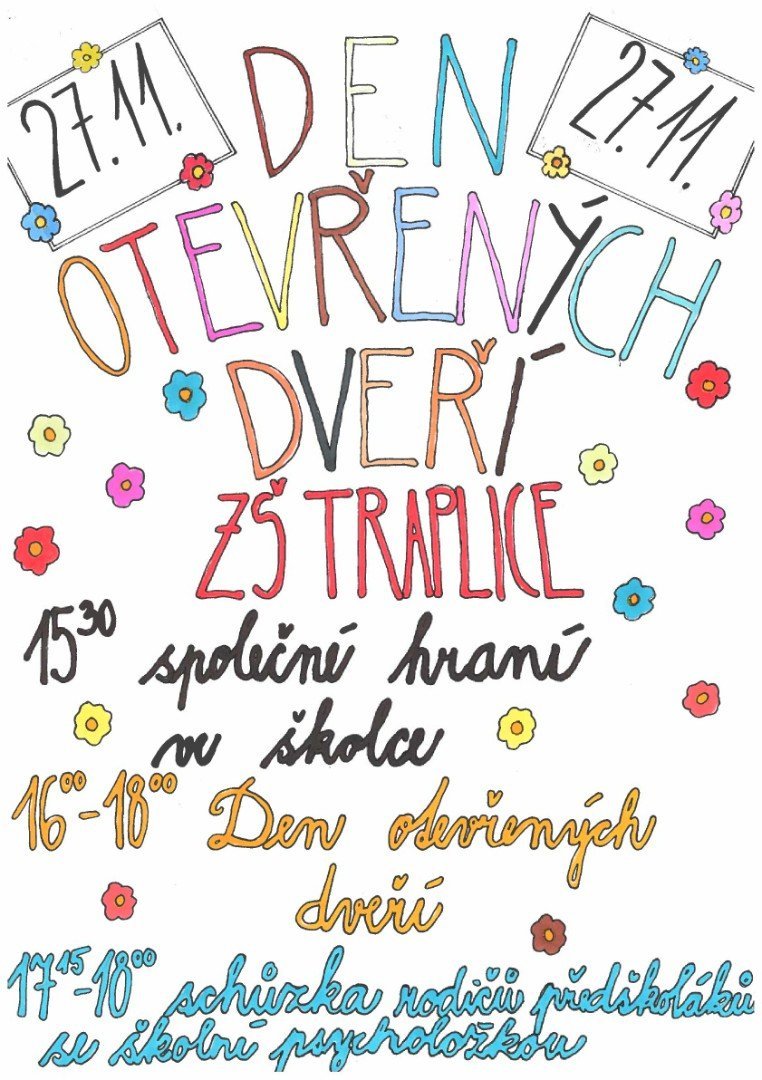 Základní škola a Mateřská škola Traplice zve všechny rodiče - zvláště budoucích žáků - na prohlídku školy 27.11.2025. Od 15:30 jsou připraveny aktivity v mateřské škole, od 16:00 do 18:00 je možné si prohlédnout školu. V každé třídě na I.stupni je připravena prezentace toho co vše ve škole děláme. Od 17:15 do 18:00 je pro rodiče předškoláků připravena beseda s paní psycholožkou. Srdečně zveme rodiče i děti na prohlídku i seznámení se vším co zajímavého se ve škole děje a co škola nabízí.