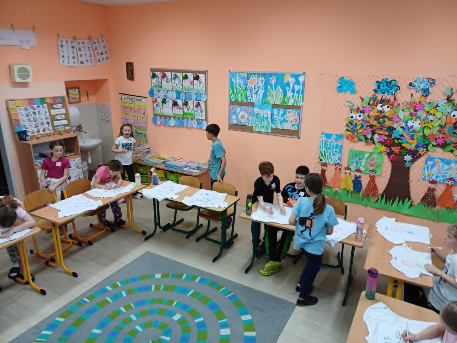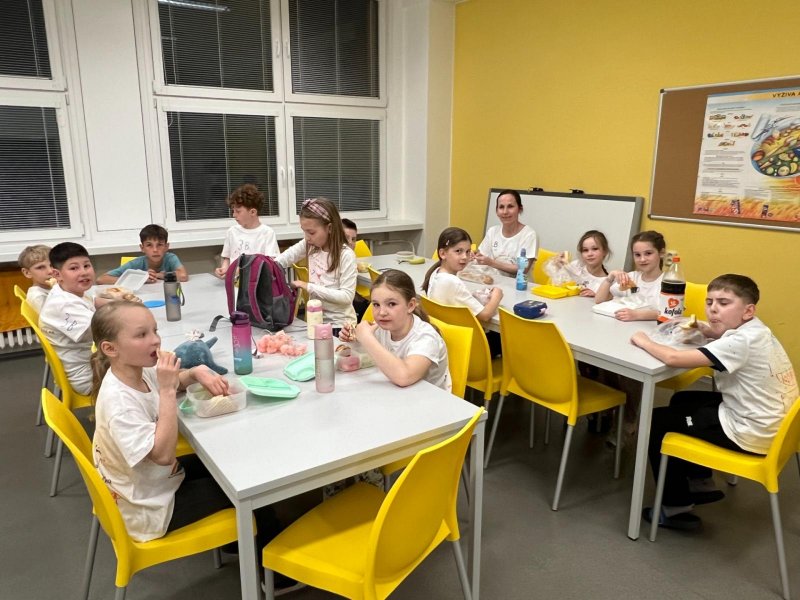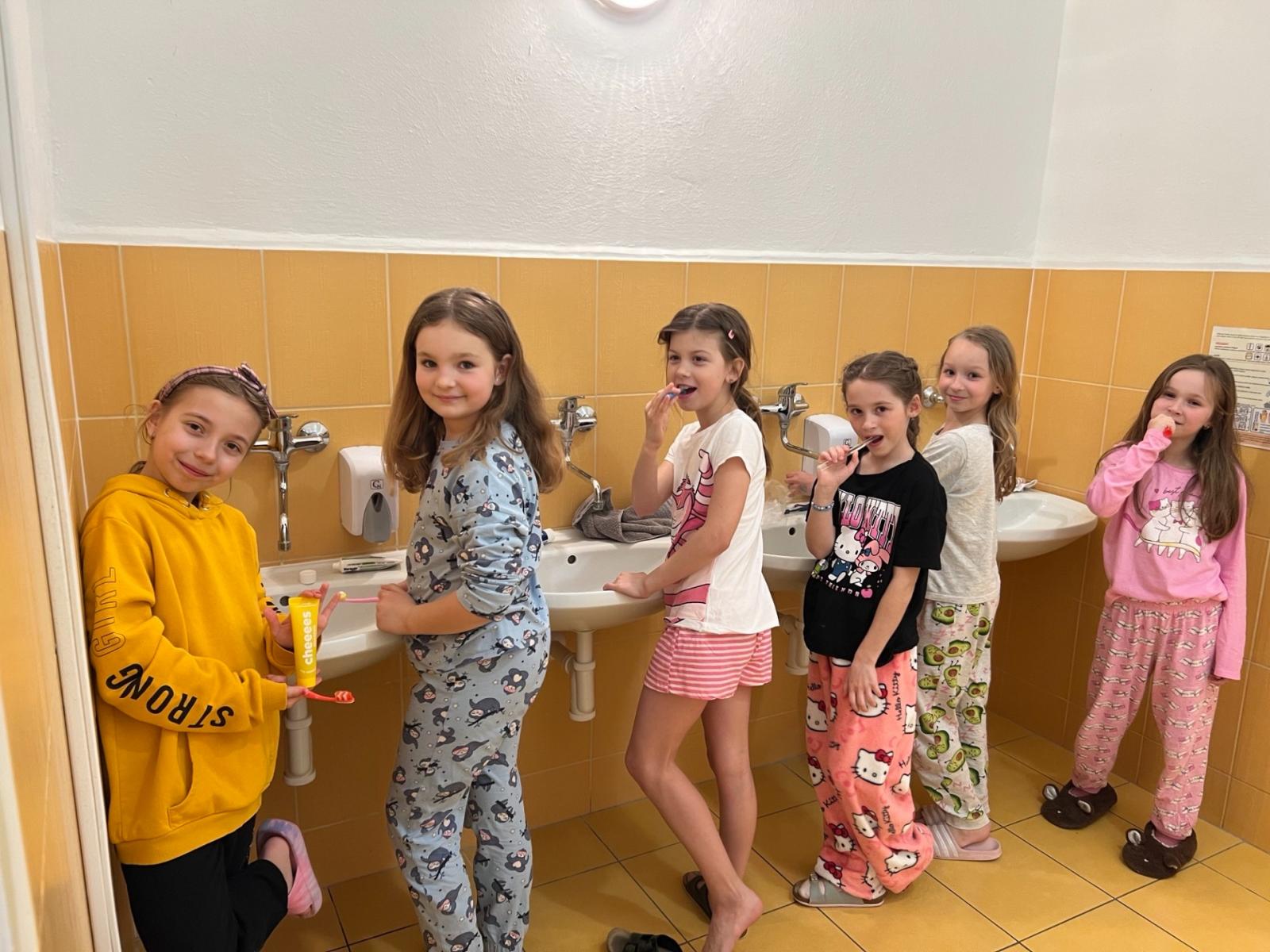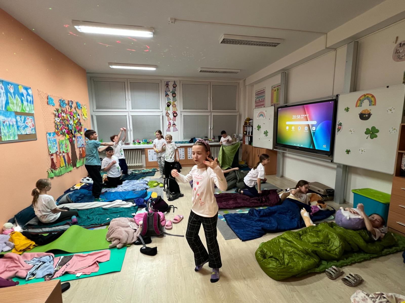 V dubnu na nás čekala odměna za půlroční plnění úkolů - spaní ve škole. Sešli jsme se v pátek navečer a vyrazili hledat poklad, který nám schoval skřítek neznámého jména. Po správném splnění všech úkolů jsme rozšifrovali jméno skřítka (Patrik) a to nám otevřelo dveře k hledání pokladu. Poklad byl schovaný velmi dobře, ale podařilo se nám jej najít. Potom jsme se pustili do výroby třídních triček, které nám budou připomínat tuto akci. Jakmile se setmělo a opravu nebylo vidět na špičku nosu, vydali jsme se s baterkami prozkoumat všechna zákoutí naší školy. Byl to pro nás takový "tajuplný" zážitek, škola v noci působila zcela jinak. Potom již následovala menší diskotéka, film a po vyčištění zoubků hůrá do svých pelíšků, které jsme si předtím pečlivě přichystali. Ráno jsme ještě stihli chvilku navštívit tělocvičnu a potom jsme se rozešli domů. Myslím, že na tuto noc nezapomeneme a budeme na ni s úsměvem na tváři vzpomínat. Bylo to skvělé :)