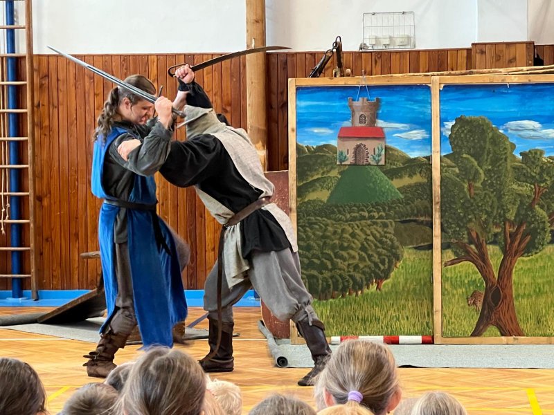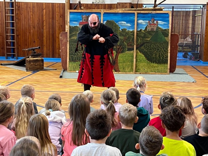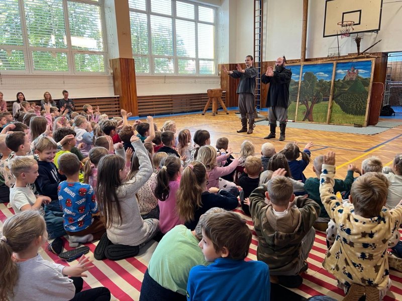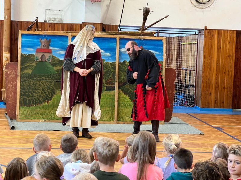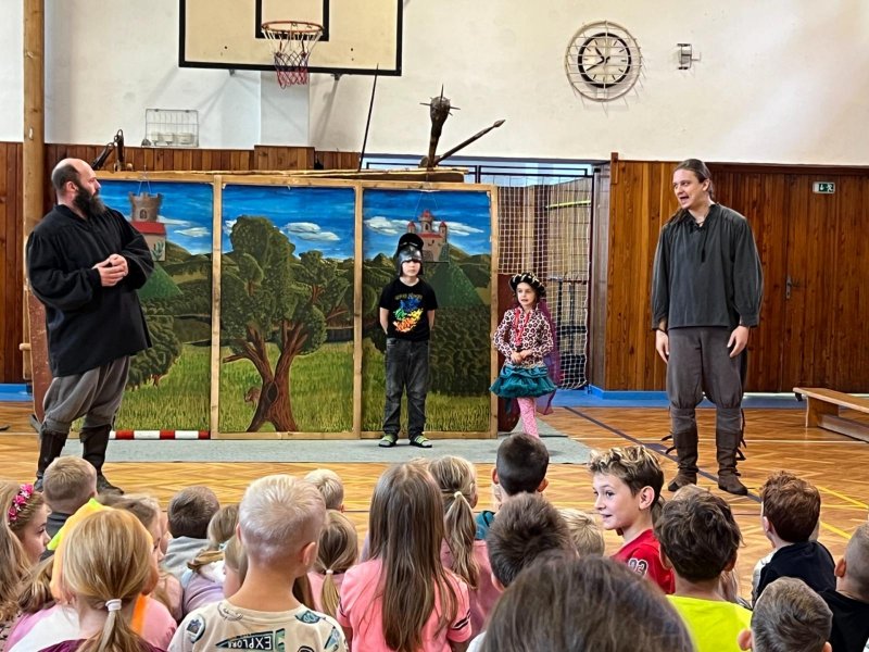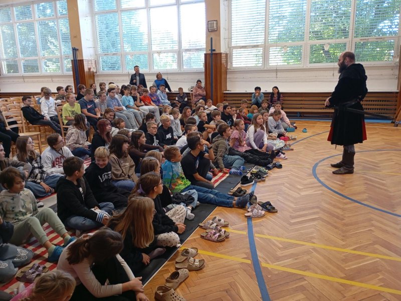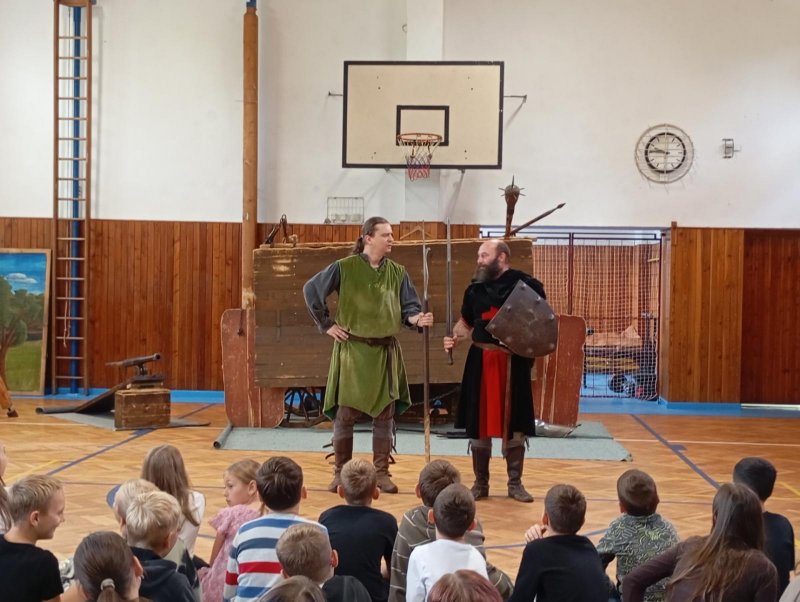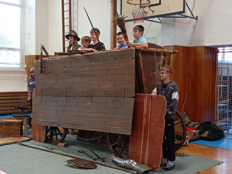 Po několikaleté pauze k nám opět zavítali herci z umělecké Agentury Pernštejni. Hravou formou nás seznámili s bojovou taktikou, vybavením či zbraněmi husitů. Chybět nemohla samozřejmě ani šermířská ukázka. A dokonce došlo i na zpěv! A když naši žáci obsadili bojový vůz, nebralo nadšení konce.
