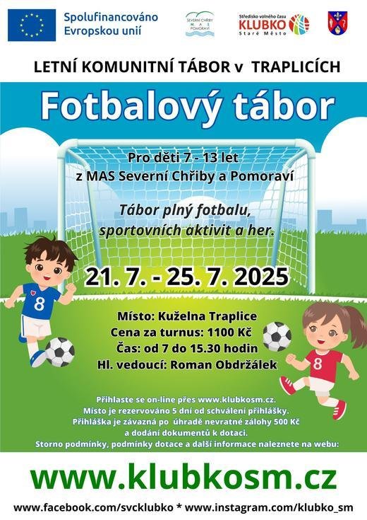 Středisko volného času KLUBKO Staré Město nabízí letní fotbalový tábor v Traplicích v termínu 21. - 25. 7. 2025.