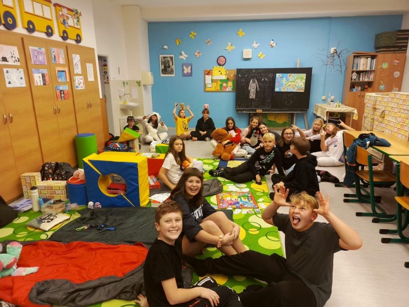 Od začátku školního roku si naše 6. třída dává a plní různé třídní výzvy. Za jednu z nich si žáci vybrali opravdu netradiční odměnu – přespání ve škole. A tak jsme se 14. listopadu v 17:00 sešli před školou, připraveni na nezapomenutelný večer.