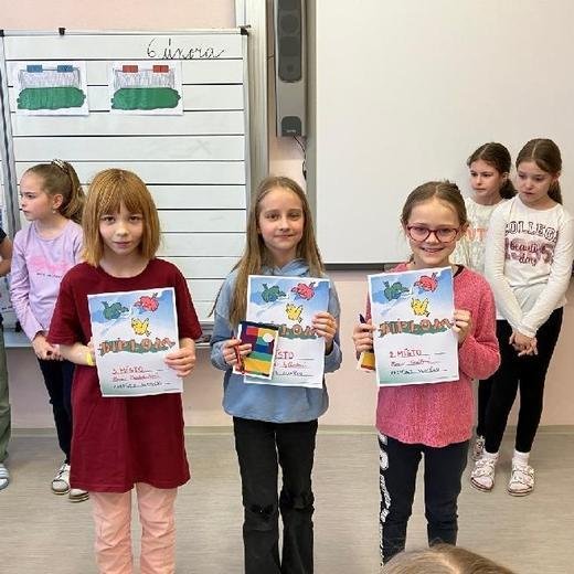 Za podpory všech spolužáků, kteří byli v roli diváků, slavily naše dívky úspěch. Ve své kategorii se umístily Viktorka Tyllichová na prvním místě a Maruška Kocábová na druhém místě. Gratulujeme.