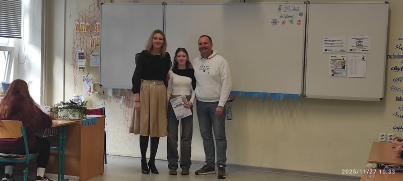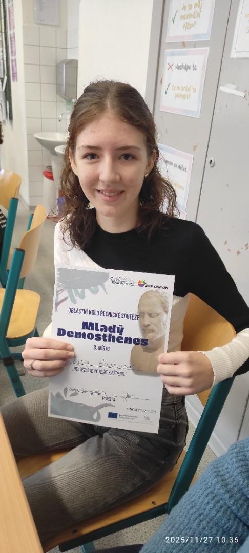 Málokdo by do této tiché dívky řekl, že zvládne řečnit před více než dvěma desítkami svých vrstevníků. Však stalo se a Klárka v okrskovém kole řečnické soutěže Mladý Demosthenés, které proběhlo v ZŠ Staré Město, vybojovala vynikající 3. místo. Naši školu reprezentovala neméně skvěle i Eliška Šrámková. Všichni účastníci řečnického klání museli prokázat své rétorické umění, když museli na vylosované téma (naše dívky si vylosovaly: Nové vynálezy v budoucnosti a Co pokládáš za největší neštěstí) hovořit jen s minutovou přípravou v daném časovém intervalu, kterým byla opět 1 minuta. Hodnotila se originalita, plynulost, vhodně volená slova apod. Holkám děkujeme za vzornou reprezentaci školy a gratulujeme.