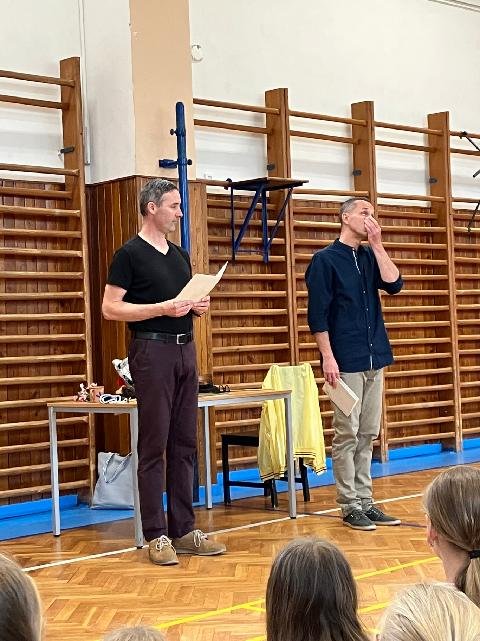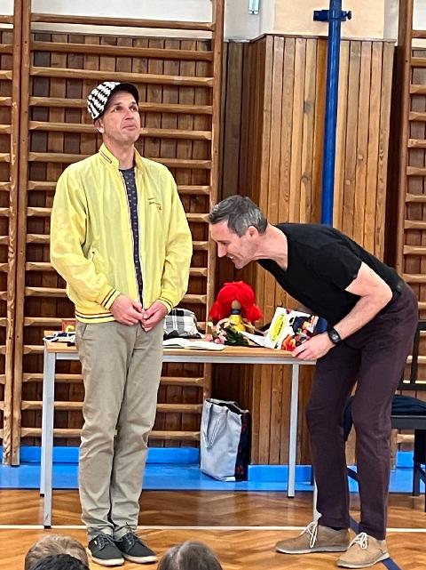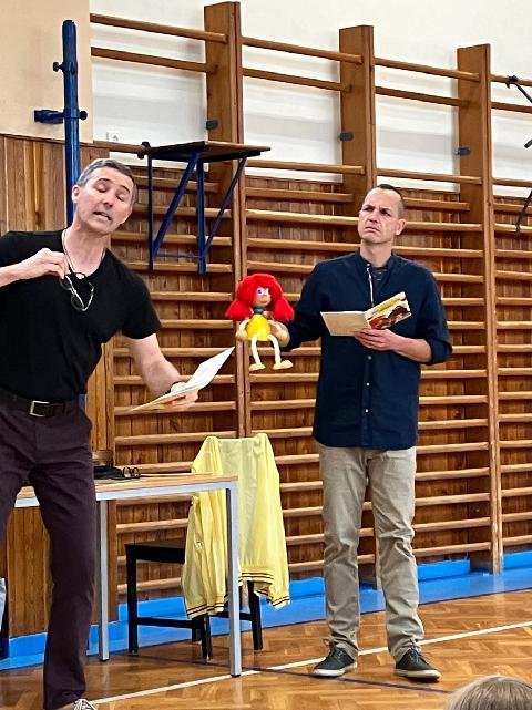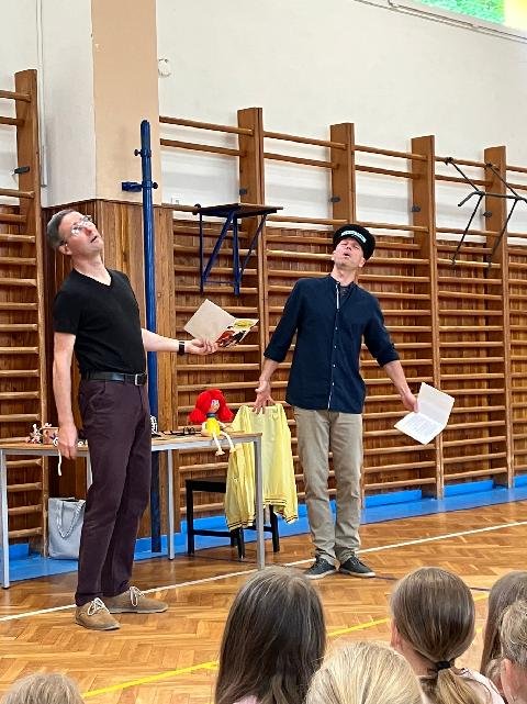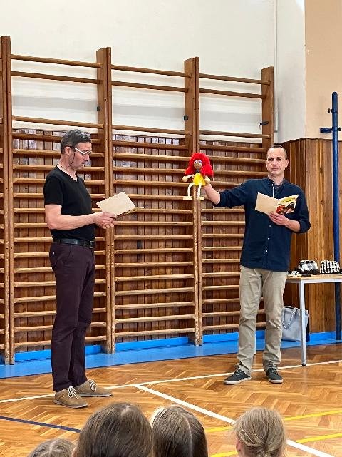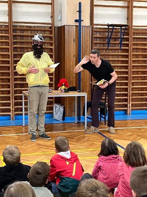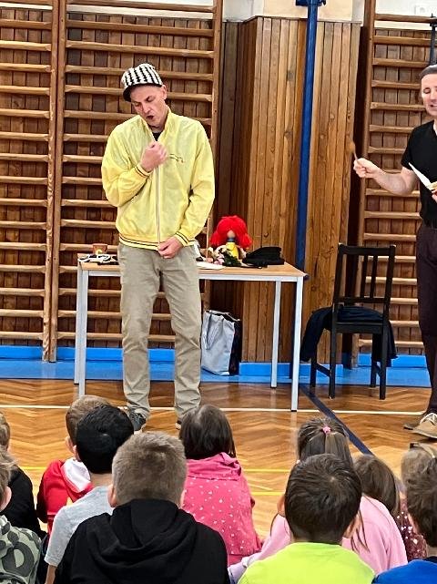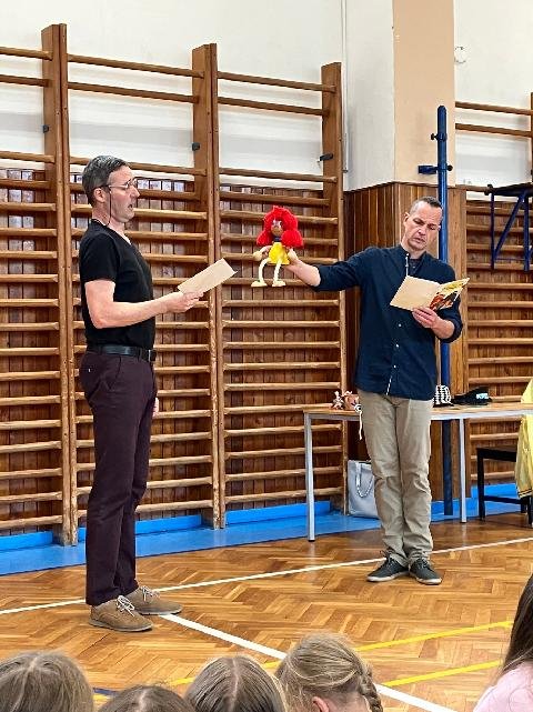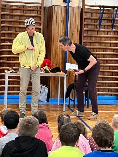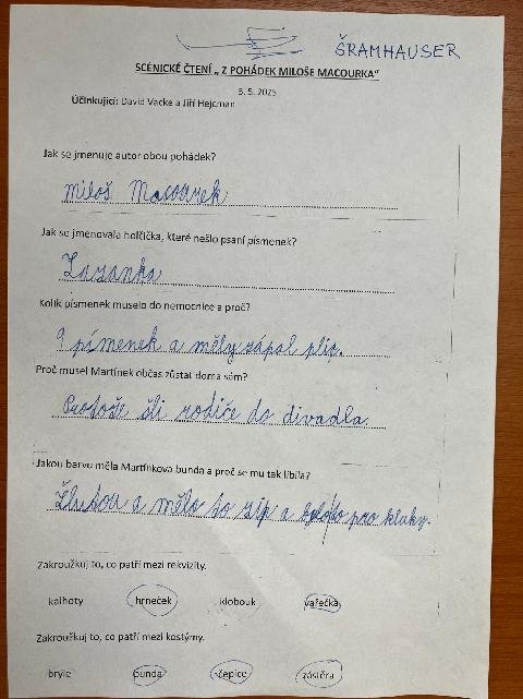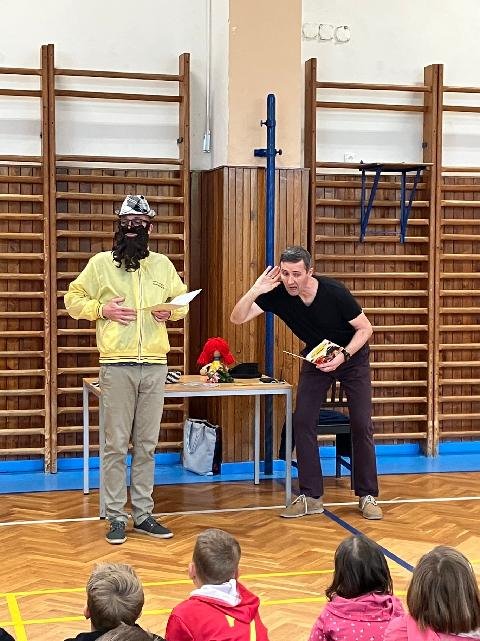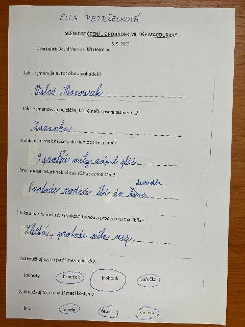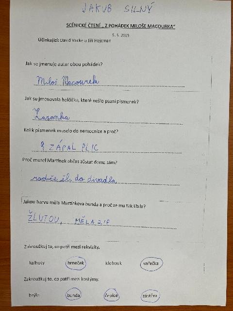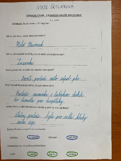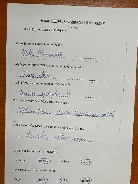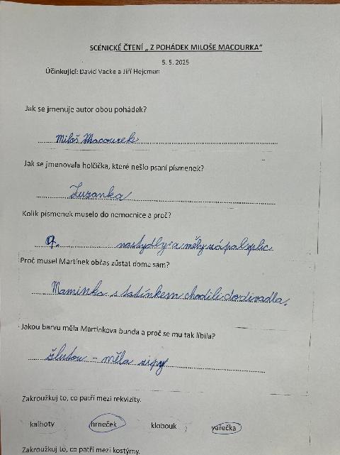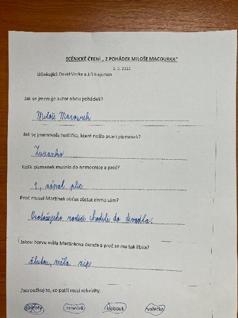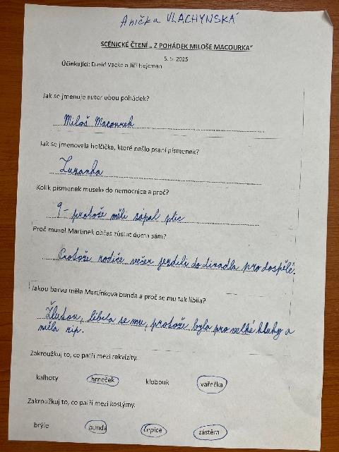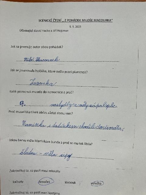 V pondělí 5. května jsme měli možnost zhlédnout scénické čtení, ve kterém učinkovali herci Slováckého divadla David Vacke a Jiří Hejcman. Herci se nechali inspirovat dvěma pohádkovými příběhy Miloše Macourka "Zuzanka a písmenka" a "Žlutá bunda s pokaženým zipem". Po představení jsme si v českém jazyce připomněli bohatou literární tvorbu Miloše Macourka i oblíbené postavičky jako jsou Mach, Šebestová, opice Žofka, Arabela, Rumburak a další. Ve výuce jsme si díky pracovním listům prověřili, jak jsme byli při představení pozorní.