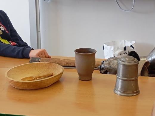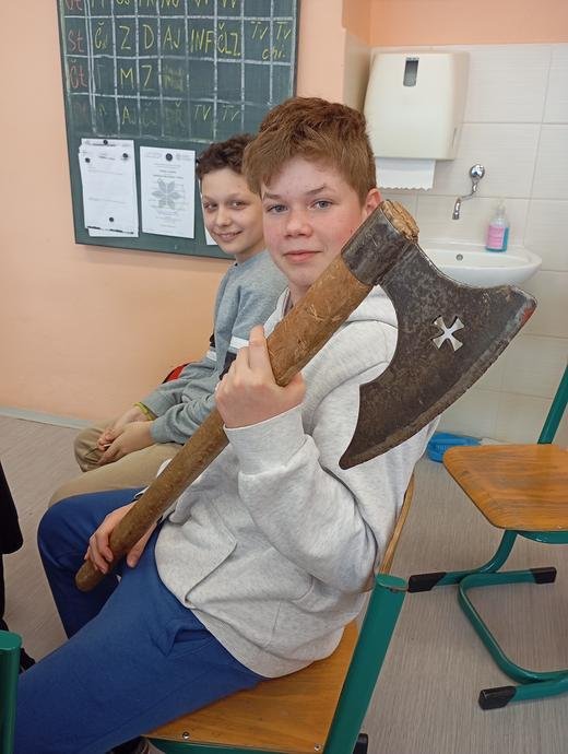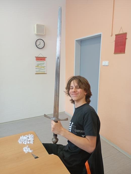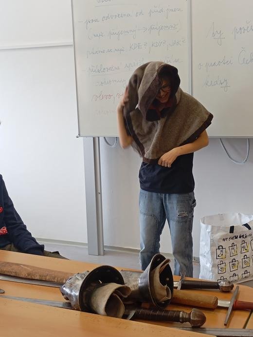 Stroj času jsme sice neobjevili, ale díky panu Pavlu Balounovi jsme otevřeli pomyslné okno do minulosti. Pan Baloun nám přivezl ukázat středověké zbraně, zbroj (nikoli brnění, jak už vím i já), nádobí, oblečení. Žáci měli možnost si všechno prohlédnout i vyzkoušet, osahat.