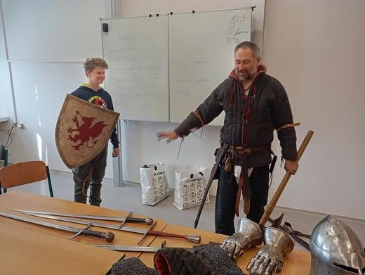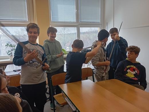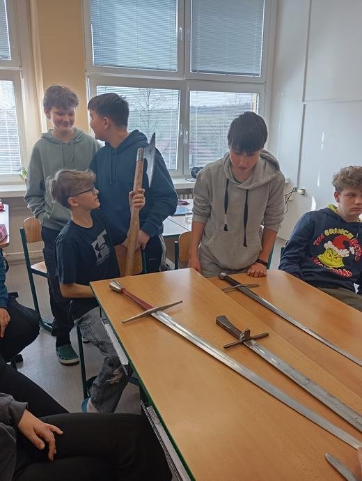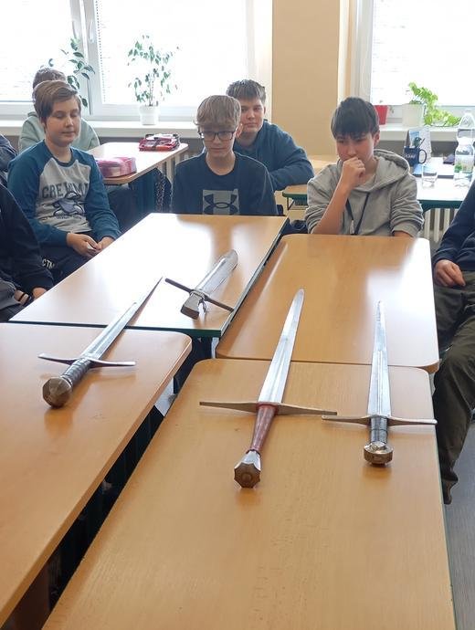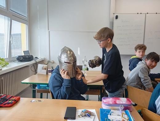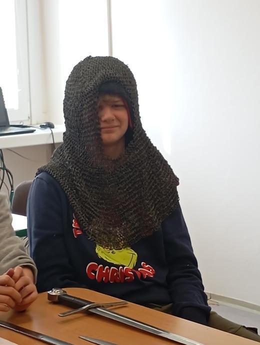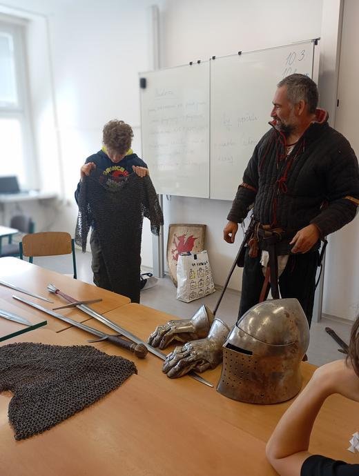 Žáci sedmého ročníku se momentálně učí o středověku. Doba je to pro nás už hodně vzdálená a jen těžko si naši žáci dokáží představit život tehdejších lidí. Učíme se o významných panovnících, ukazujeme si obrázky. Ale mít tak možnost přenést se chvilku strojem času daleko do minulosti, sáhnout si na zbraně, vyzkoušet helmu i meč, to by bylo něco!
